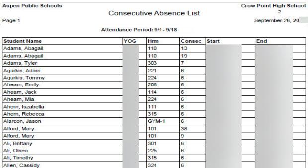 For each student, the report lists year of graduation, number of consecutive absences, and the start and end date of each period of consecutive absences.