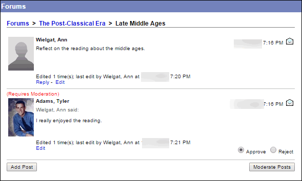 1. After you have selected Approve or Reject for all applicable posts, click Moderate Posts. Posts that you approved are viewable by all members, and posts you rejected are hidden.