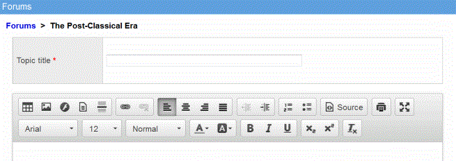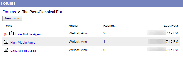 A forum can have multiple topics to help direct the conversation. For example, during a world history unit, you could have a forum titled "The Post-Classical Era", with three topics that span the entire unit: Early Middle Ages, High Middle Ages, and Late Middle Ages. For each topic, users can either reply to another user's post or create a new post.