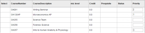 appears in the Status column. Click the icon to view the comments. - If your school allows you to set the priority for your courses, you can type a number in the Priority column to prioritize them. 1 is the highest priority. Leave the field blank if you do not want to set a priority value.
