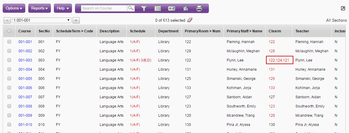 7. The following table displays how courses that are assigned to more than one room display throughout Aspen: