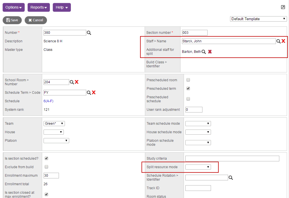 at the Additional staff for split field to select any additional teachers who can also teach this section. - Go to the Split Resource Mode field to confirm that it does not contain Not Allowed.