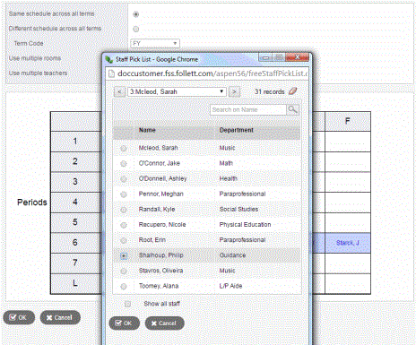 - Find and select the teacher, and click OK. That teacher now appears as assigned to that section on the day/period you clicked.