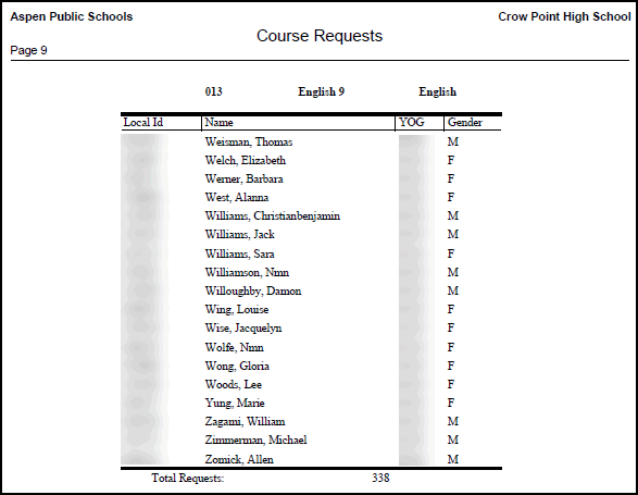 Run the Course Request List report to print a list of students who request each course, by course number. The report prints the names of the requesters, as well as their LASIDClosed Local Agency Student Identifier, year of graduation, and gender.