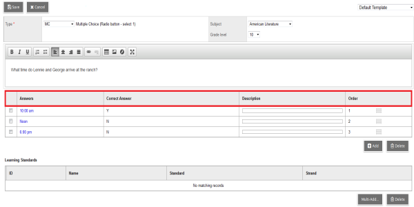 1. To associate this quiz with a learning standard, click Multi-Add. The Learning Standards pick list appears.