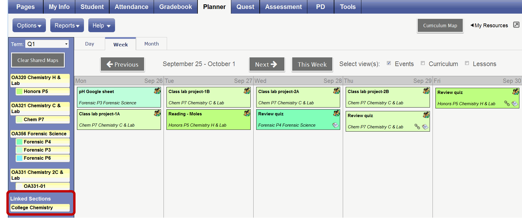 In your Planner, linked sections appear in the list of classes on the left side of the page: