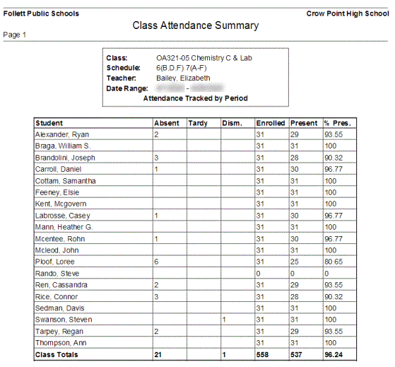 Class Attendance Summary Report