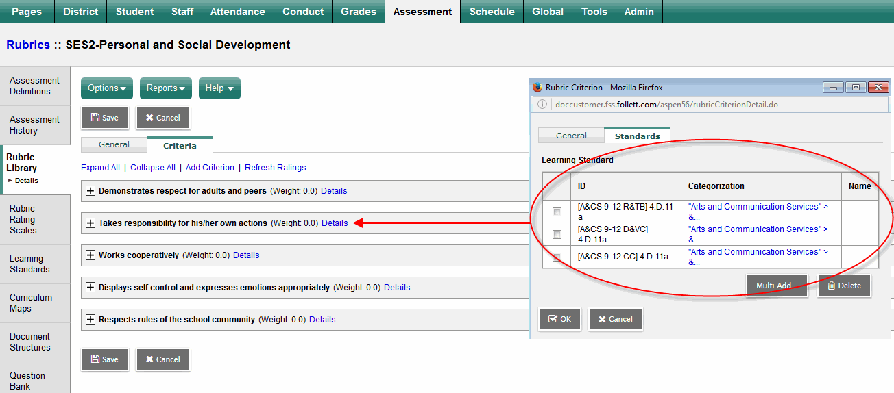 In Aspen, reporting standards are the standards teachers enter scores for. Learning standards are the concepts covered within a reporting standard, such as Common Core, or state-specific learning standards.