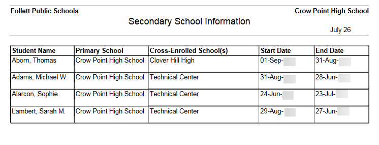 Run the Secondary School Information report to view details about cross-enrolled students. You can choose to display: