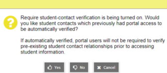 Click Yes if you want Aspen to automatically verify the student-contact relationship for contacts who already have portal access – those users will not see any difference when they log on to the Family portal. If you click No, contacts must enter the first name and date of birth of their student(s) the next time they log on to the Family portal, or they cannot view any student information. Users can verify the student-contact relationship in the desktop or mobile version of Aspen. They only do this once for each student they are associated with.